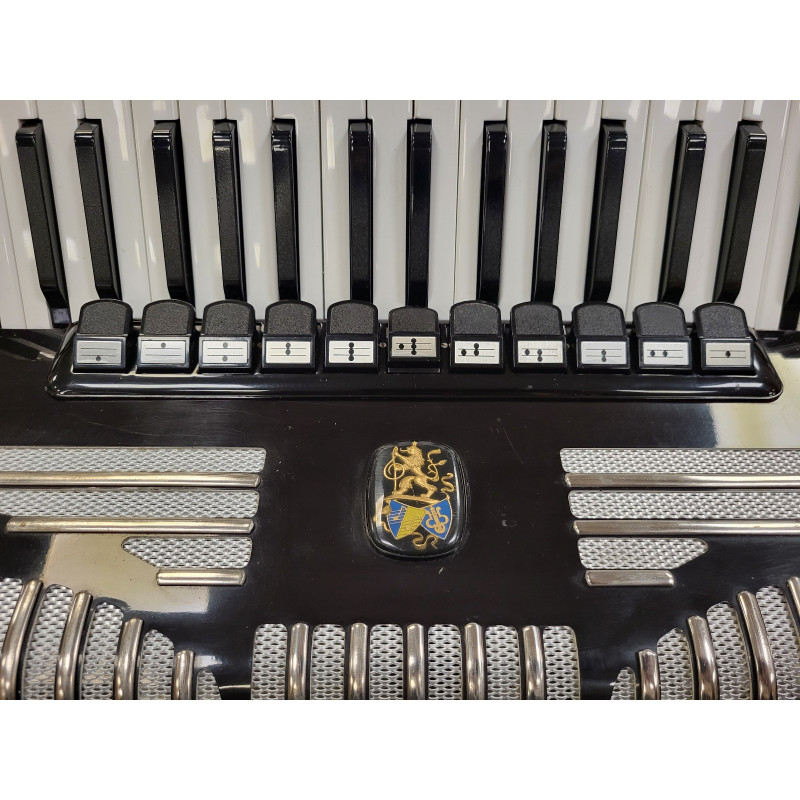 Sklep Muzyczny i Komis GAMA w Rzeszowie oferuje Państwu niemiecki akordeon wyprodukowany w zakładach Weltmeister, model UNIVERSUM Elegance 120-basowy, o niewielkiej wadze 10,5 kg, wraz z oryginalnym futerałem widocznym na ostatnim zdjęciu oraz nowym kompletem pasów.