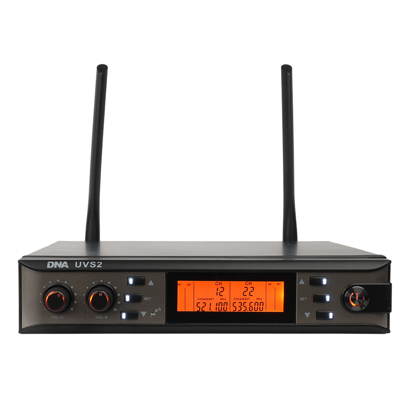 Drugą część systemu DNA UVS 2 stanowi odbiornik fal radiowych (UHF) pracujący w zakresie częstotliwości od 518 do 542 MHz. Na tylnej części jego obudowy znajdują się dwa zbalansowane wyjścia XLR dla kanałów 1 i 2, niezbalansowane wyjście typu jack (1/4”) dla kanałów 1 i 2, gniazdo zasilania oraz dwa złącza antenowe BNC. W części przedniej mieści się przełącznik zasilania, dwa potencjometry głośności, odbiornik podczerwieni oraz podwójny panel sterowania z czytelnym wyświetlaczem LCD pokazującym aktualne parametry pracy systemu, takie jak poziom sygnału RF/AF, ustawienie częstotliwości odbiornika, wybrany kanał pracy, a także to, czy mikrofony są aktualnie włączone, czy wyłączone. Korzystając z przycisków Up, Down i Set możemy dokonać ręcznego wyboru częstotliwości lub przeprowadzić automatyczny skan, podczas którego do urządzeń systemowych przypisana zostanie niezakłócona częstotliwość.
