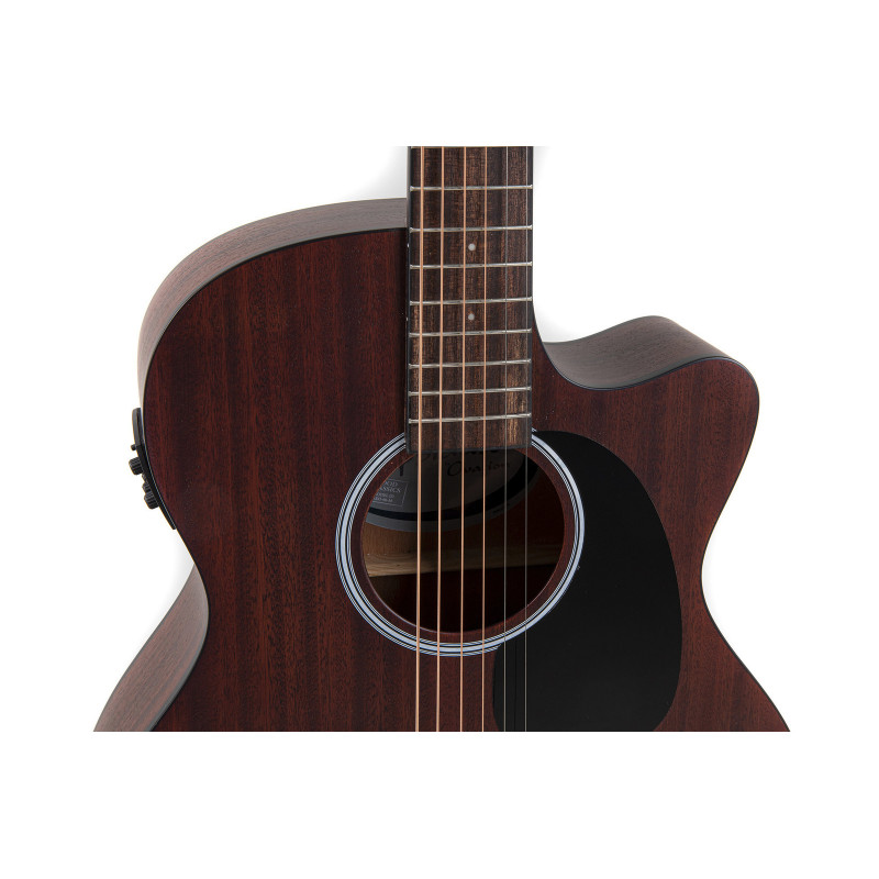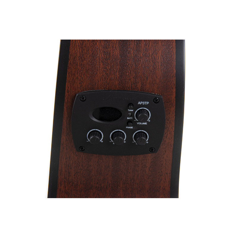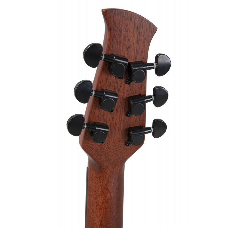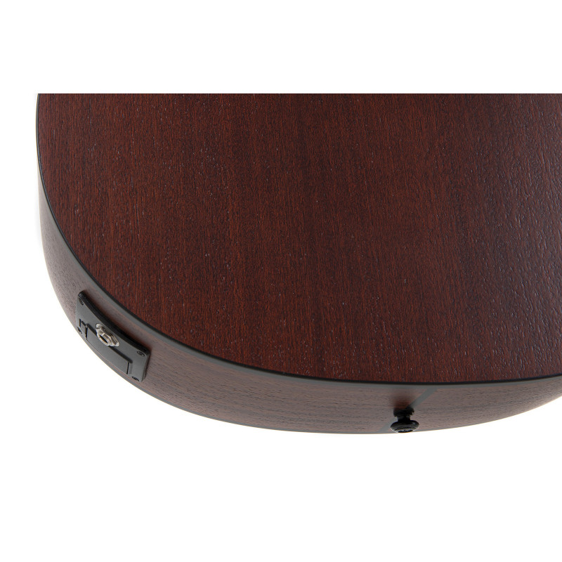 Top, tył i boki wykonane z mahoniu zapewniają głębokie, zbalansowane brzmienie z akcentem w średnim paśmie, a gryf z tej samej litej okleiny daje komfort i stabilność podczas gry. Podstrunnica i mostek z ovangkolu podkreślają naturalną barwę instrumentu i poprawiają responsywność. Mostek bez kołków ułatwia zmianę strun, a kompensowana siodełka z kości wspiera precyzyjną intonację.