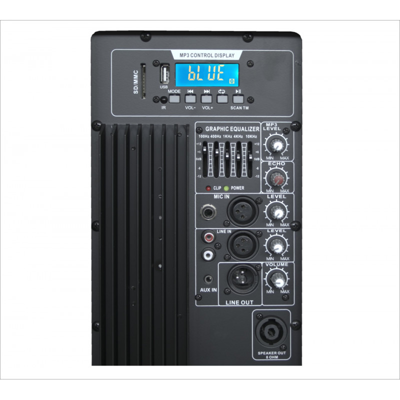 Aktywny zestaw 2-drożny o mocy 400W w nowoczesnej obudowie ze wzmacnianego tworzywa sztucznego. Wbudowany zdalnie sterowany pilotem IR odtwarzacz Mp3 z funkcją nagrywania w formatach MP3, WMA, wyposażony w wejście pamięci USB, łącze bezprzewodowe Bluetooth oraz odbiornik radiowy FM.