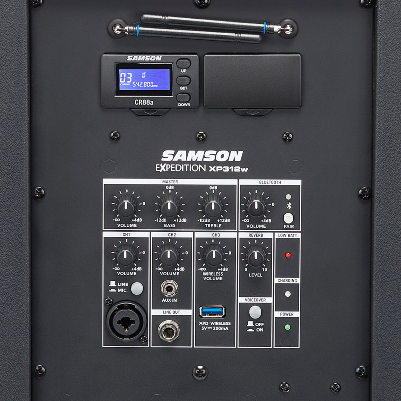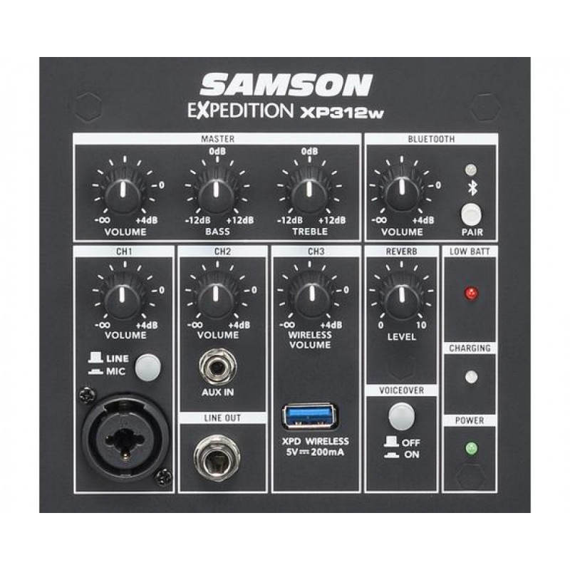 Samson Expedition XP312w jest odpowiedzią na potrzeby tych, którzy potrzebują świetnie brzmiącego mobilnego sprzętu audio. Dzięki mocy 300 W, 12-godzinnemu czasowi pracy na akumulatorze, zamontowanemu na górze 4-kanałowemu mikserowi i łączności Bluetooth XP312w zapewnia dźwięk muzykom, DJ-om i osobom biorącym udział w różnych imprezach na świeżym powietrzu. W zestawie znajduje się również mikrofon bezprzewodowy z regulacją częstotliwości, który umożliwia pracę bez użycia przewodów.