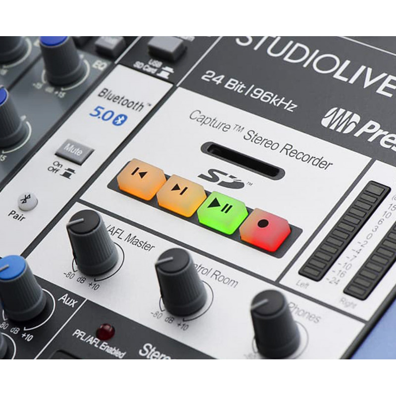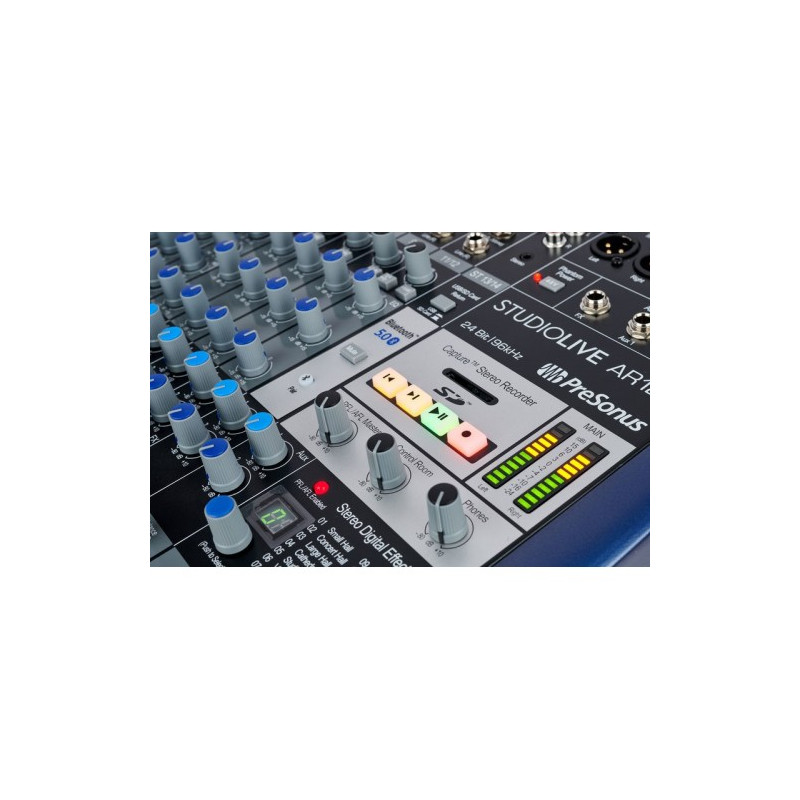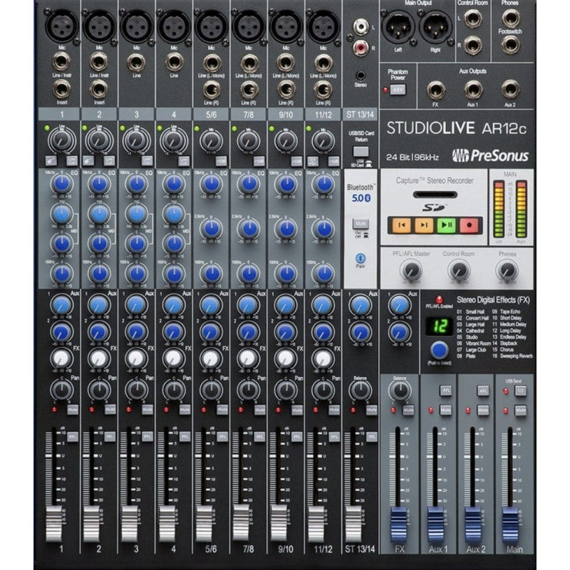 StudioLive AR12c, wyposażono we wszystkie połączenia i elementy sterujące potrzebne do miksowania i nagrywania w studio i na scenie. Cztery kanały mono i cztery kanały stereo zawierają 3-pasmowy korektor oraz jeden ze słynnych przedwzmacniaczy mikrofonowych PreSonus XMAX.