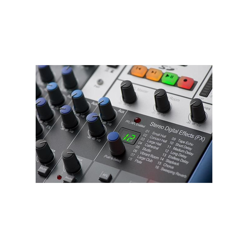 • Procesor efektów stereofonicznych z 16 presetami, dedykowane wysyłki i powroty oraz gniazdo przełącznika nożnego bypass