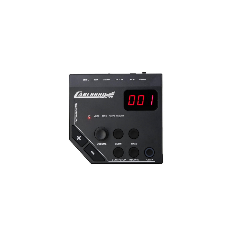 Moduł Commander 100 zawiera 108 różnych brzmień perkusyjnych, 10 wstępnie ustawionych zestawów perkusyjnych i 2 zestawy perkusyjne zdefiniowane przez użytkownika, co pozwala na tworzenie własnego, spersonalizowanego brzmienia. Moduł posiada również 10 utworów demonstracyjnych, funkcję nagrywania i odtwarzania, gniazdo Aux In, dzięki czemu można odtwarzać ulubione utwory, stereofoniczne wyjście słuchawkowe i monofoniczne wyjście liniowe do podłączenia do zewnętrznego wzmacniacza.