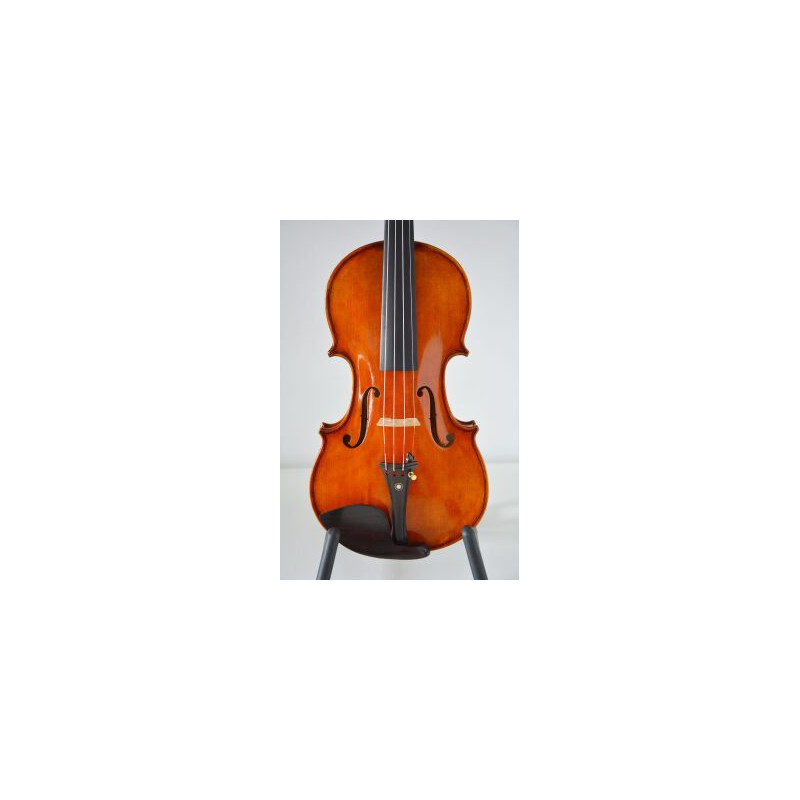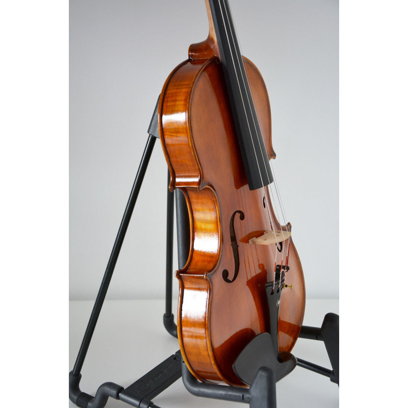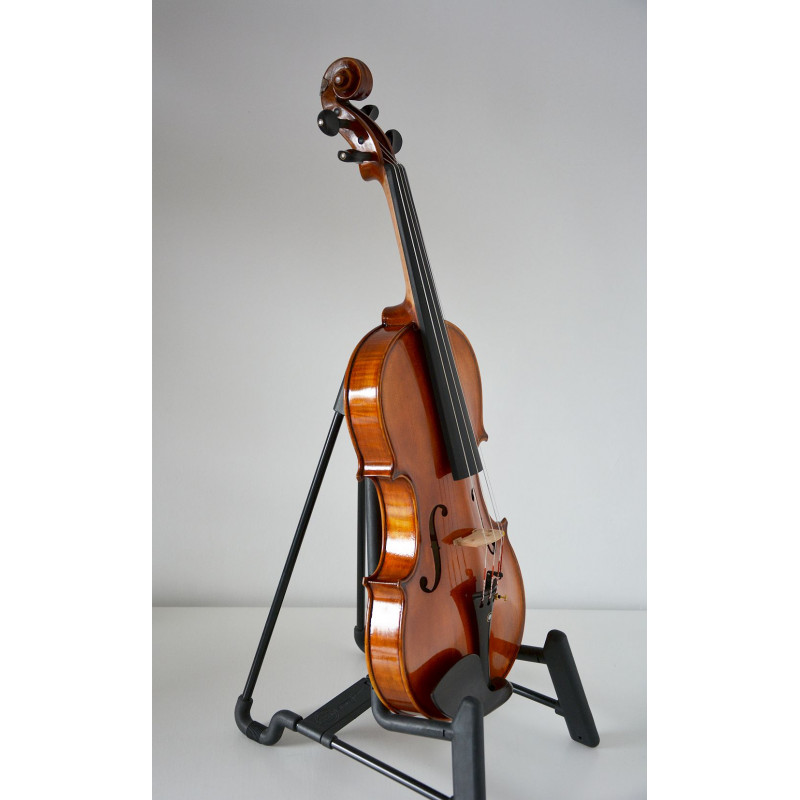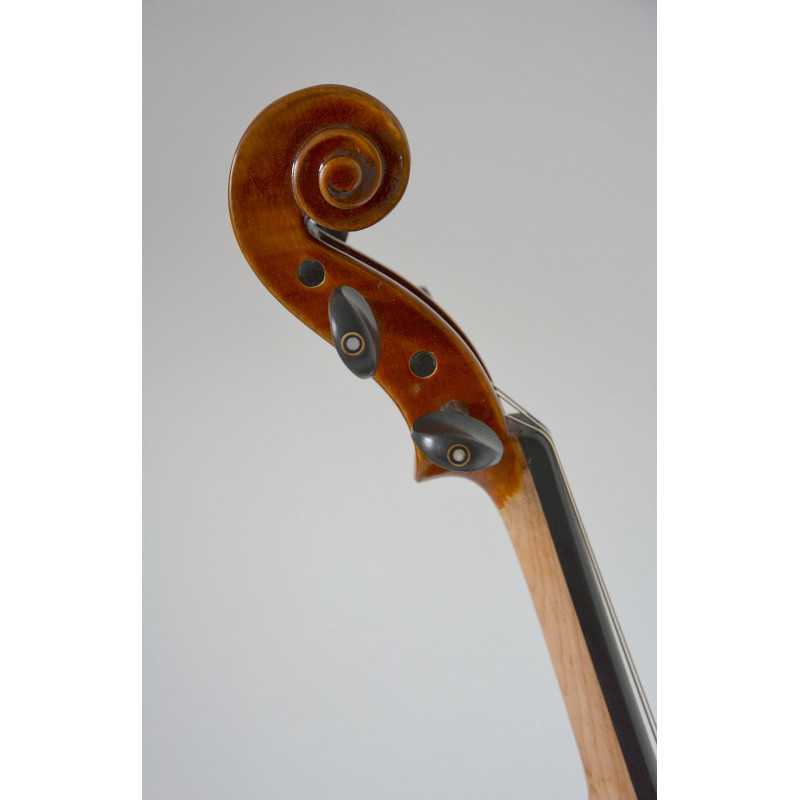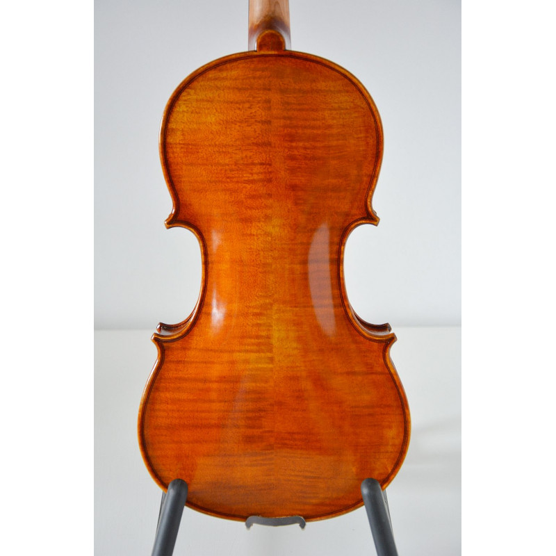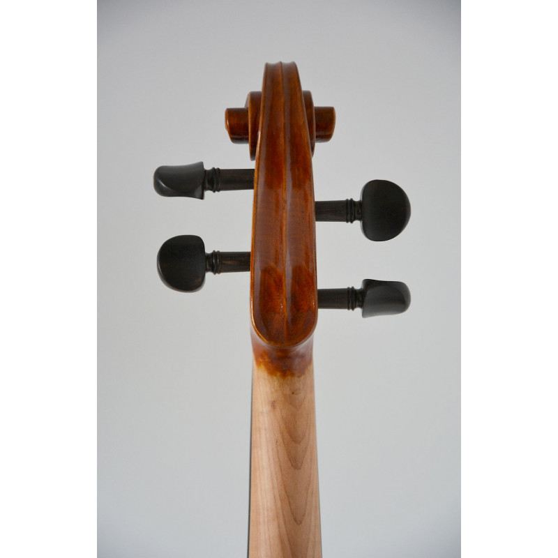 Duży, nośny dźwięk. Szerokie, głębokie brzmienie instrumentu. Interesująca barwa instrumentu. Selektywny dźwięk o dużej przejrzystości. Płyta wierzchnia świerkowa, płyta spodnia jaworowa o umiarkowanej fali. Lakier spirytusowy temperowany brąz. Garnitur hebanowy.