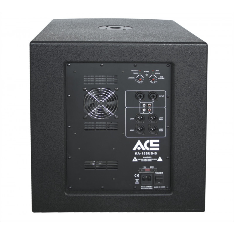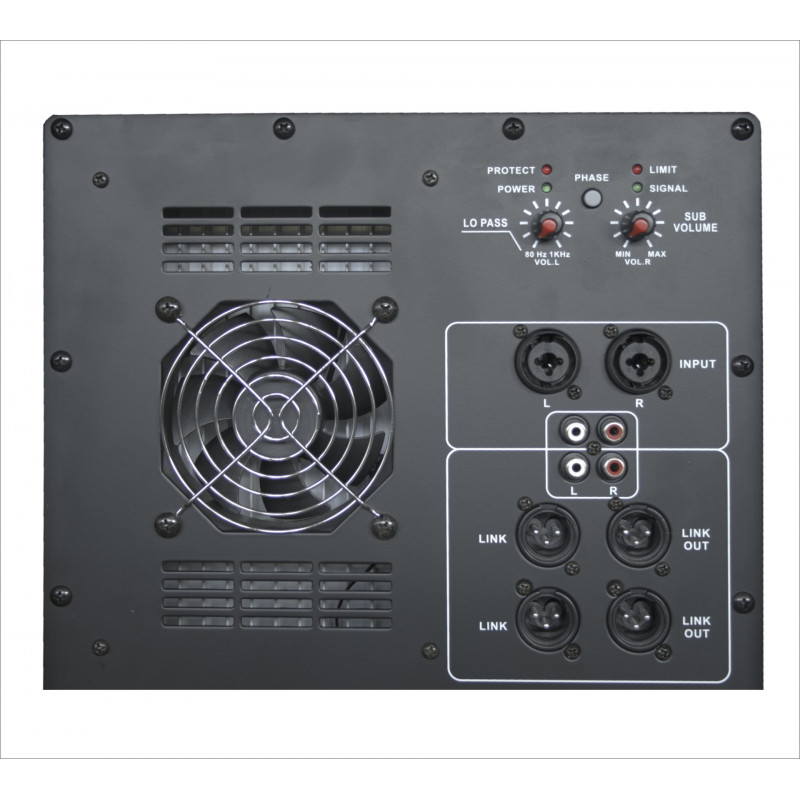 Wbudowana aktywna zwrotnica niskoczęstotliwościowa wyposażona w przełączanie odwrócenia fazy 0°/180°, regulację głośności, płynną regulację progu odcięcia filtra dolnoprzepustowego, wskaźnik limitera sygnału wejściowego LIMIT, wskaźnik sygnału SIGNAL, zabezpieczenia PROTECT oraz zasilania POWER