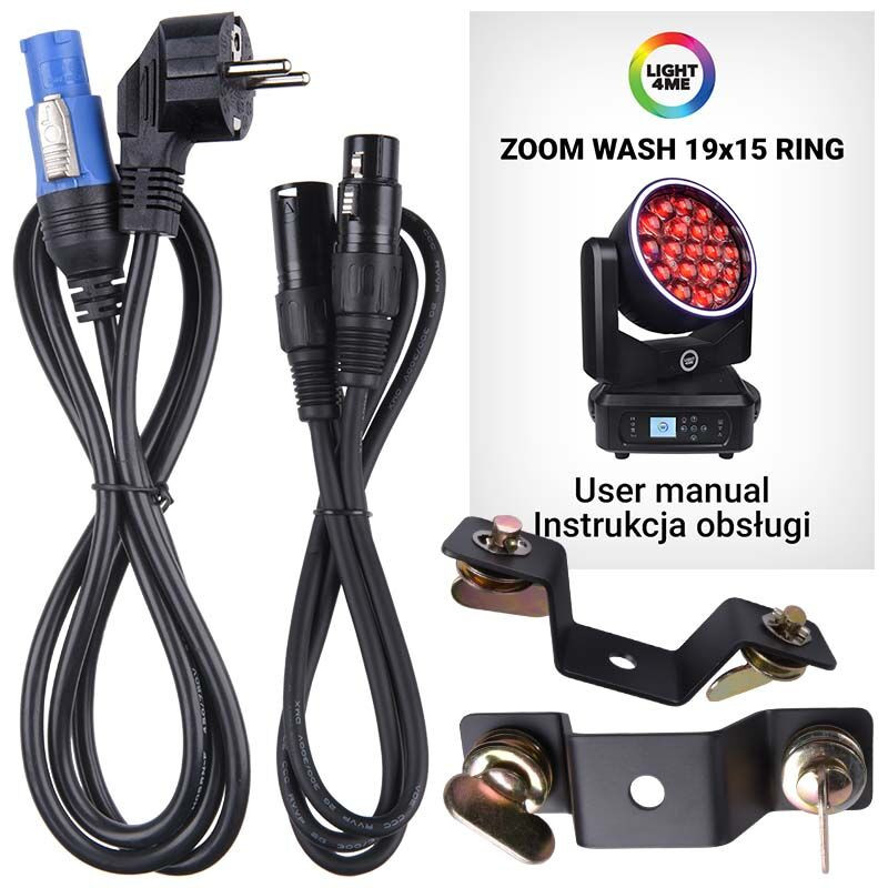Light4Me Zoom Wash 19x15 Ring to nowoczesna, w pełni profesjonalna głowica ruchoma typu LED wash wyposażona w zaawansowany system mieszania kolorów, zautomatyzowany zoom oraz specjalny ring świetlny umożliwiający kreowanie dodatkowych ciekawych efektów wizualnych. Urządzenie posiada wydajny moduł LED o łącznej mocy 360 watów, dzięki któremu znakomicie spisuje się na scenie koncertowej i teatralnej, w studio telewizyjnym oraz na planie filmowym. To także świetna głowica dla mobilnych DJ-ów, zespołów, firm eventowych oraz klubów muzycznych i dyskotek, umożliwiająca doświetlenie parkietu tanecznego i tworzenie niesamowitych efektów świetlnych.