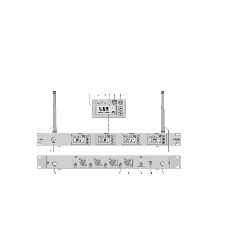 | Odbiornik, wyjścia audio | 350mV/600Ω (6.3mm)25mV/600Ω (XLR, sym.) |