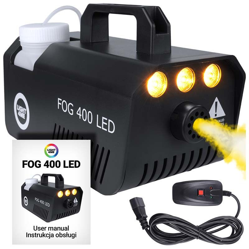 Wytwornica dymu Light4Me Fog 400 LED wyposażona została w nagrzewnicę o mocy 400 watów, dzięki której maszyna jest gotowa do pracy po upływie zaledwie kilku minut. System 3 diod operujących światłem w kolorze bursztynowym, znajdujący się nad dyszą wylotową dymiarki, oświetla emitowaną parę, dzięki czemu efekt wyrzucanego dymu wygląda jeszcze ciekawiej. Sterowanie wyrzutem odbywa się za pomocą wygodnego nożnego pilota na przewodzie o długości 3 metrów. Czerwona i zielona dioda na sterowniku informuje nas, czy maszyna jest już gotowa do pracy.